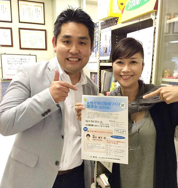 写真は明後日5月10日に行われる「女性が輝く地域づくり講演会」の告知チラシを持つ二人です。