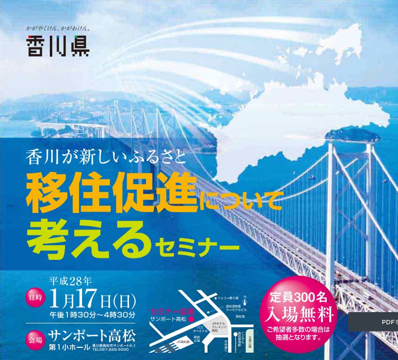 来たる1月17日(日)、香川県主催の「移住促進について考えるセミナー」に弊社代表の徳倉がパネルディスカッションに登壇します。